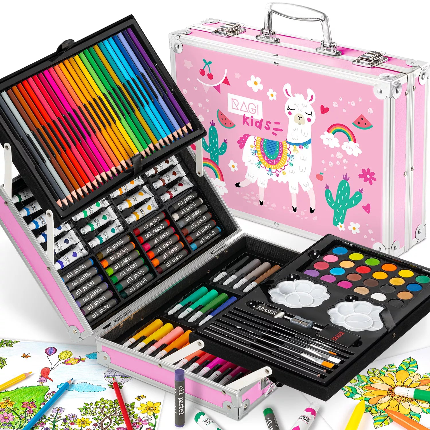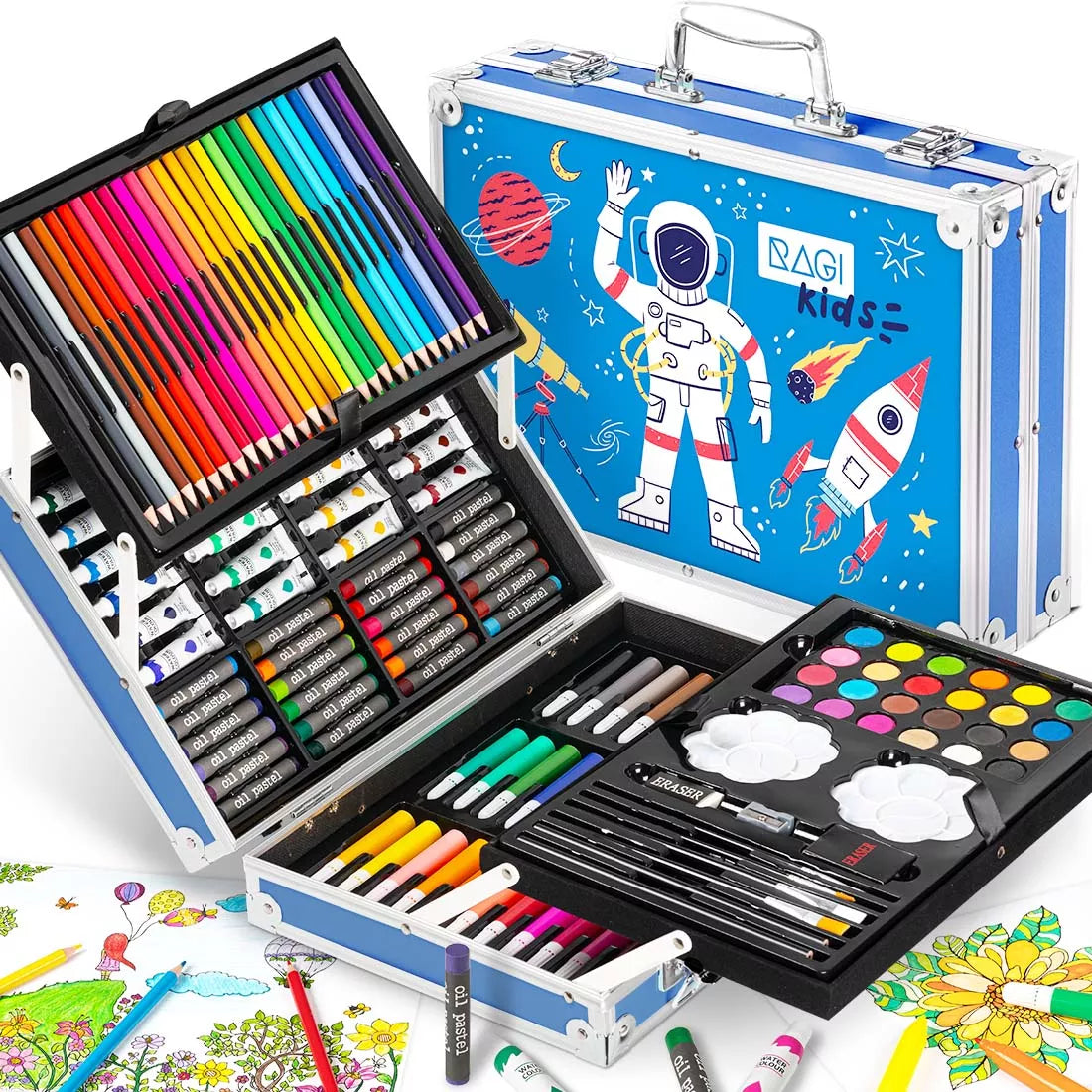 Tapymo ir piešimo rinkinys vaikams: kreidelės, dažai, flomasteriai, pastelės, lagaminas