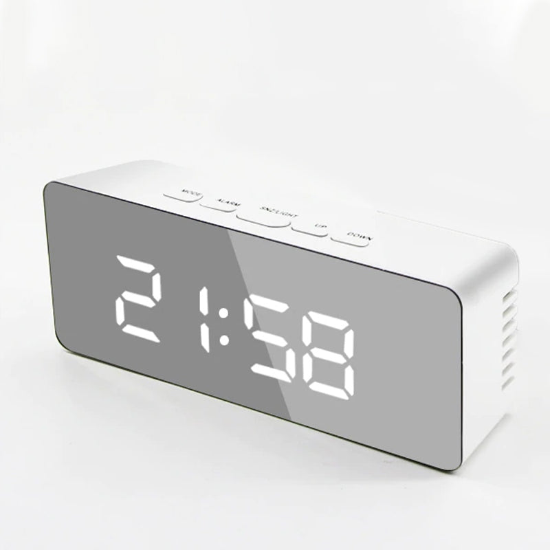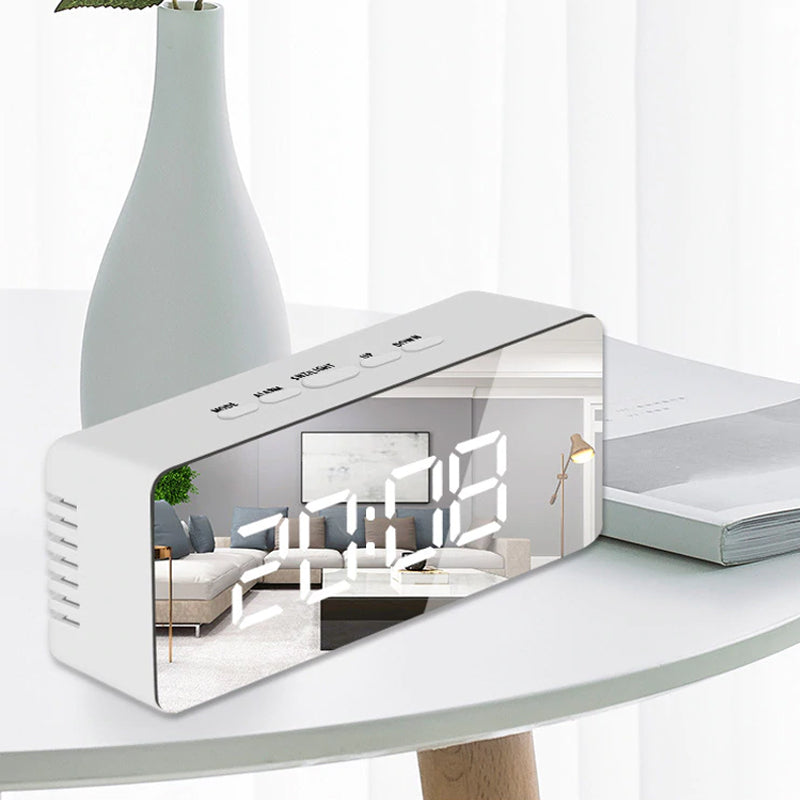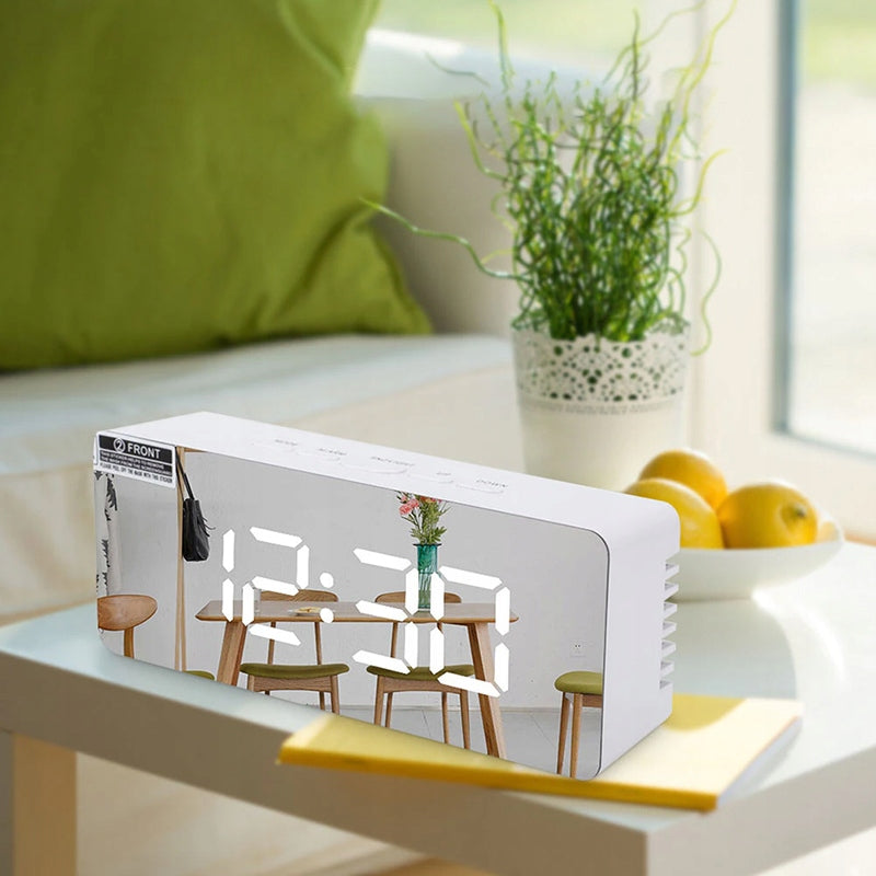 Šio laikrodžio dizainas – tai modernumo ir elegancijos derinys. Veidrodinis priekinis skydelis suteikia jam minimalistinį ir rafinuotą išvaizdą, todėl jis lengvai dera prie bet kokio interjero – ar tai būtų miegamasis, svetainė, biuras, ar net virtuvė. LED apšvietimas yra ne tik ryškus, bet ir pritaikomas: galite pasirinkti nuolatinį apšvietimą prijungę per USB, arba automatinį apšvietimo režimą, kuris taupo energiją ir prisitaiko prie aplinkos šviesos, naktį šviesdamas mažesniu intensyvumu. Tai idealiai tinka naudoti miegamajame, kad šviesa netrukdytų miegui.