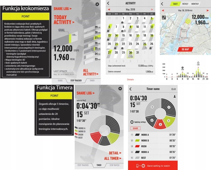 - Pažangios veiklos sekimo funkcijos (žingsniamatis, kalorijų skaičiavimas, tempo analizė) padeda siekti sportinių tikslų.