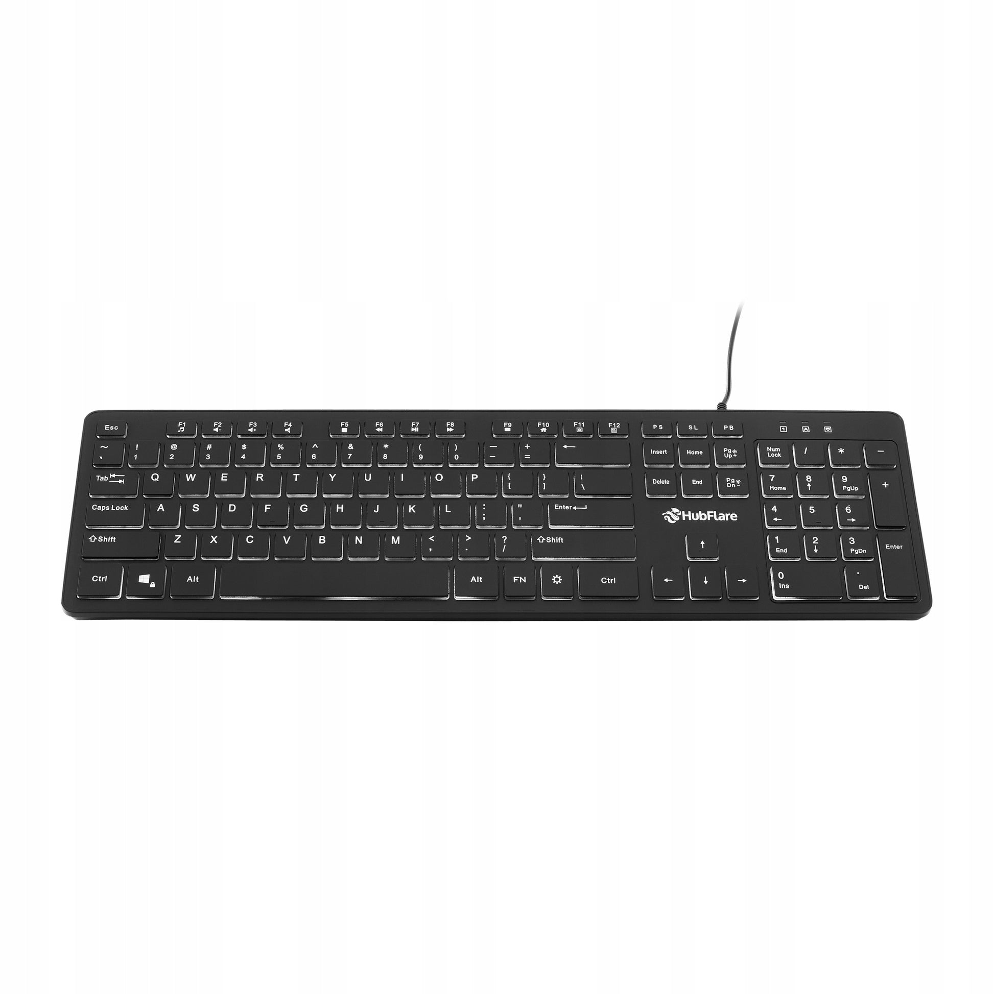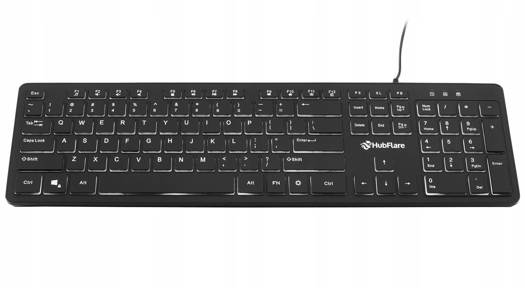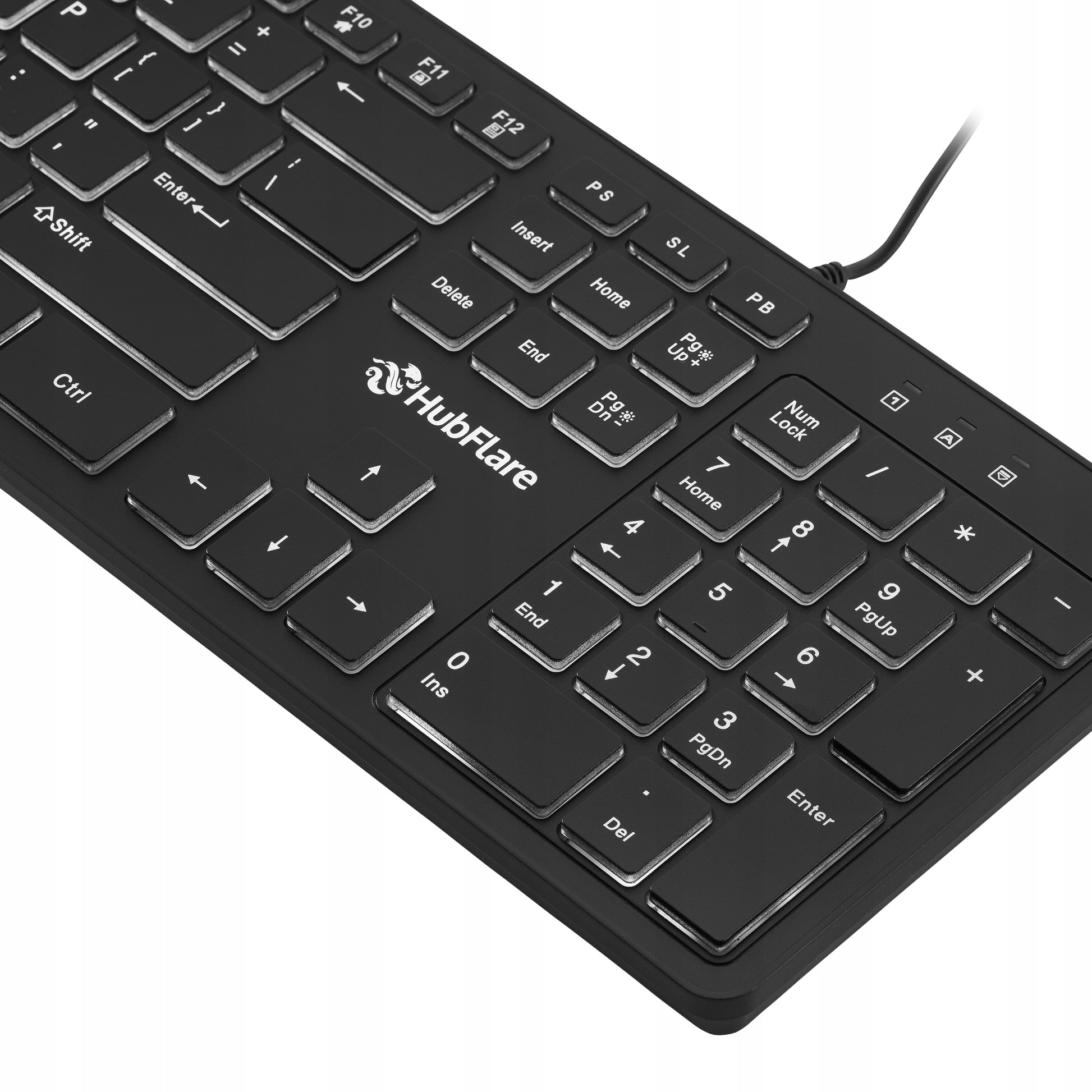 Viena ryškiausių HubFlare Huro modelio ypatybių – integruotas, baltas LED apšvietimas. Kiekvienas klavišas apšviestas ryškia šviesa, suteikiant klaviatūrai ne tik estetišką, modernią išvaizdą, bet ir žymiai pagerinant naudojimo patogumą. Galėsite komfortiškai dirbti net esant prastam apšvietimui ar vėlai vakare, nereikės įjungti papildomo šviesos šaltinio. Apšvietimo intensyvumą galima reguliuoti, o specialus „Fn“ + „Scroll Lock“ klavišų derinys suteikia malonų mirgėjimo efektą, paverčiant darbą šiek tiek interaktyvesniu. Klaviatūra turi pilną skaitmeninę dalį, todėl ypač patogi dirbant su skaičiais ir atliekant greitus skaičiavimus.