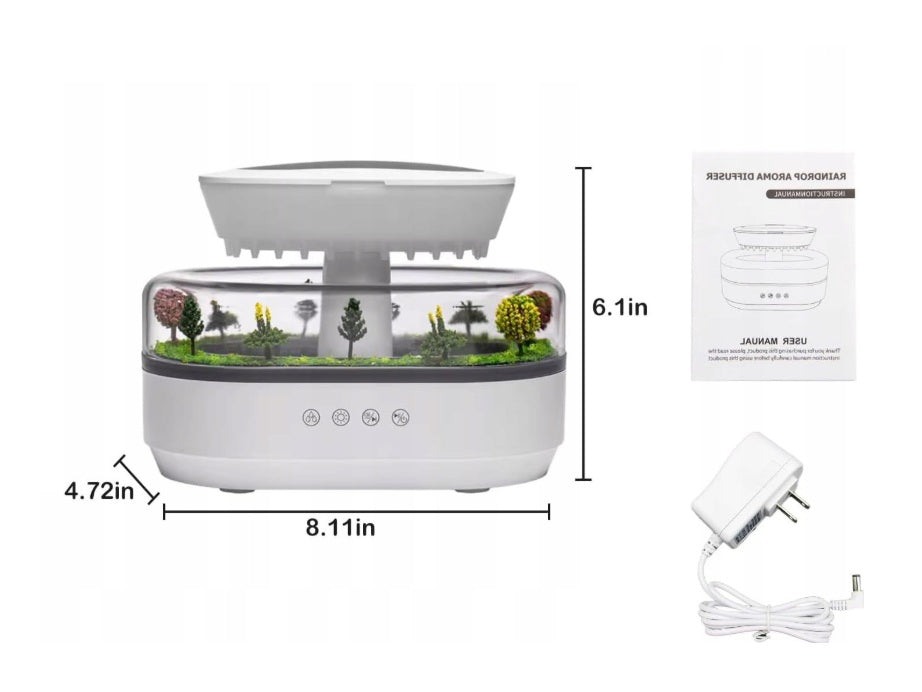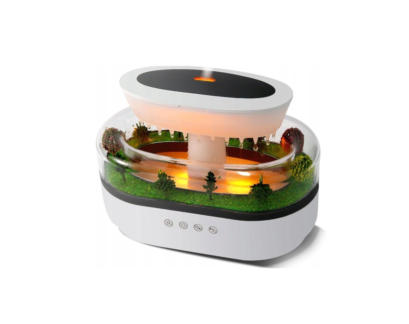 Modernus oro drėkintuvas ir eterinių aliejų difuzorius su realistiniu lietaus garso efektu – puikiai tinka poilsiui, meditacijai ar ramiam miegui. Ultragarsinė technologija skleidžia švelnią dulksną, gerinančią oro drėgmę, o įlašinus eterinio aliejaus – užpildys erdvę maloniu aromatu. Integruotas 7 spalvų LED apšvietimas su naktinės šviesos funkcija kuria jaukią atmosferą.