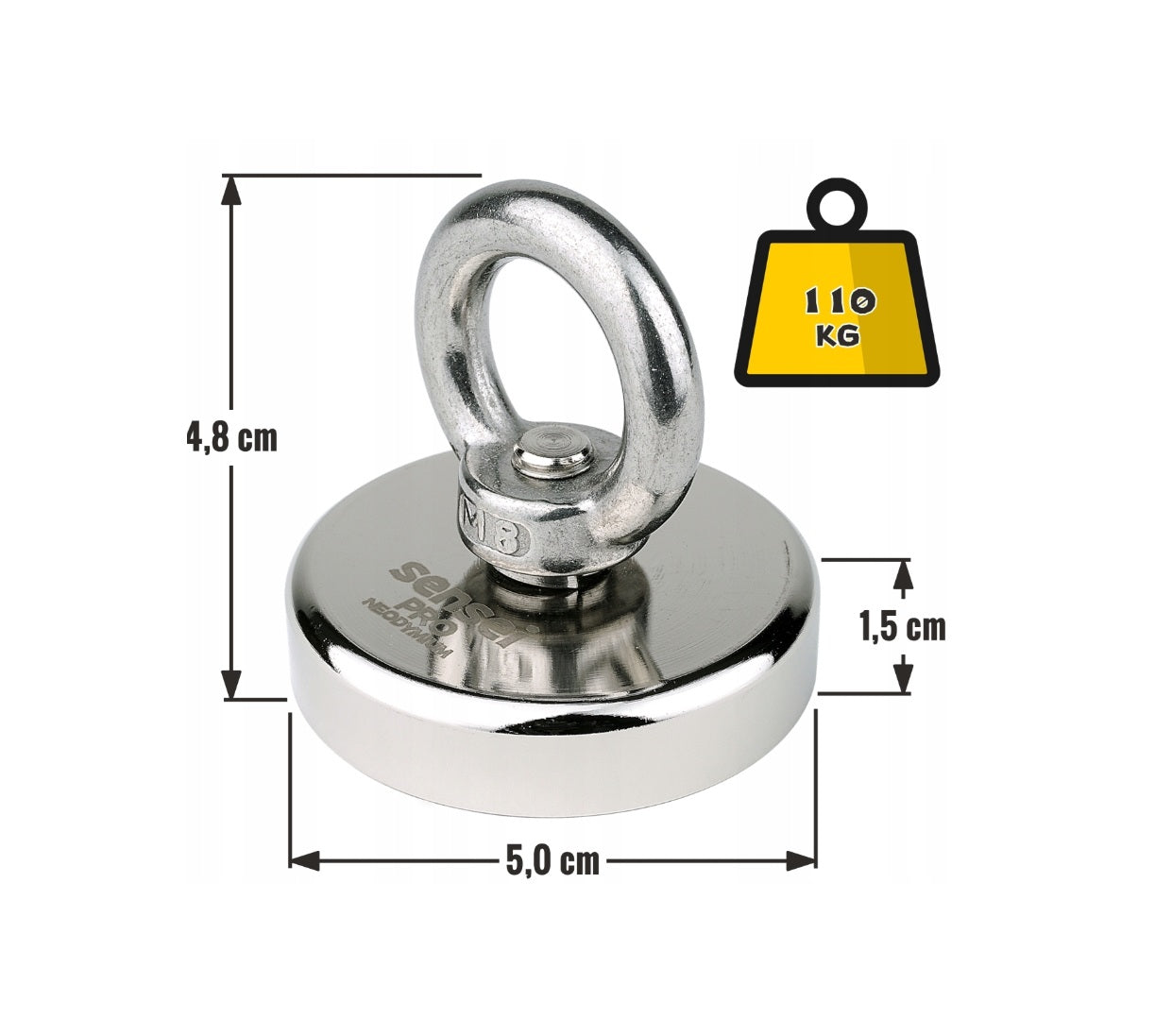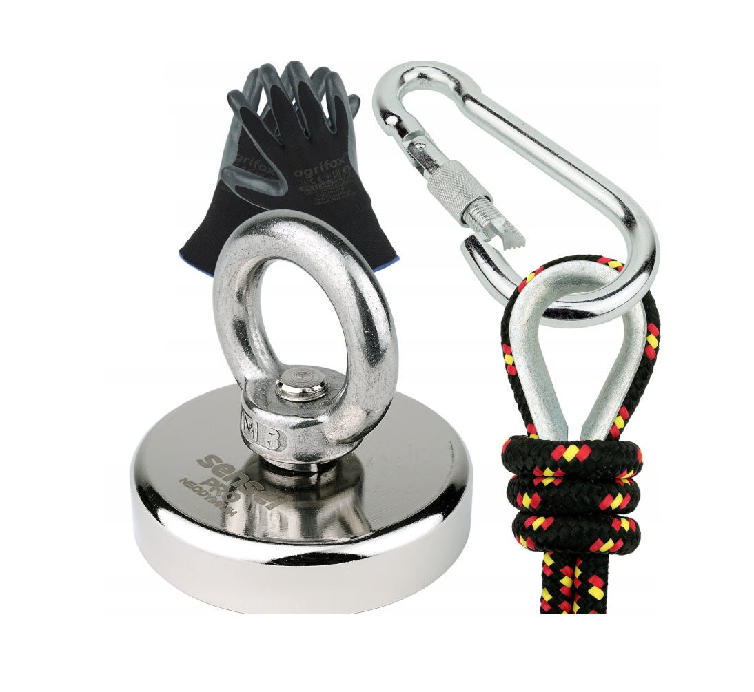 Aukščiausios kokybės N52 klasės neodimio magnetas, skirtas vandens žvejybai ir metalinių objektų paieškai. Magnetas turi tvirtą nerūdijančio plieno rankeną, padengtą antikorozine Ni–Cu–Ni danga, ir preciziškai sukonstruotą korpusą su epoksidine derva, užtikrinančia ilgalaikį atsparumą smūgiams ir drėgmei.