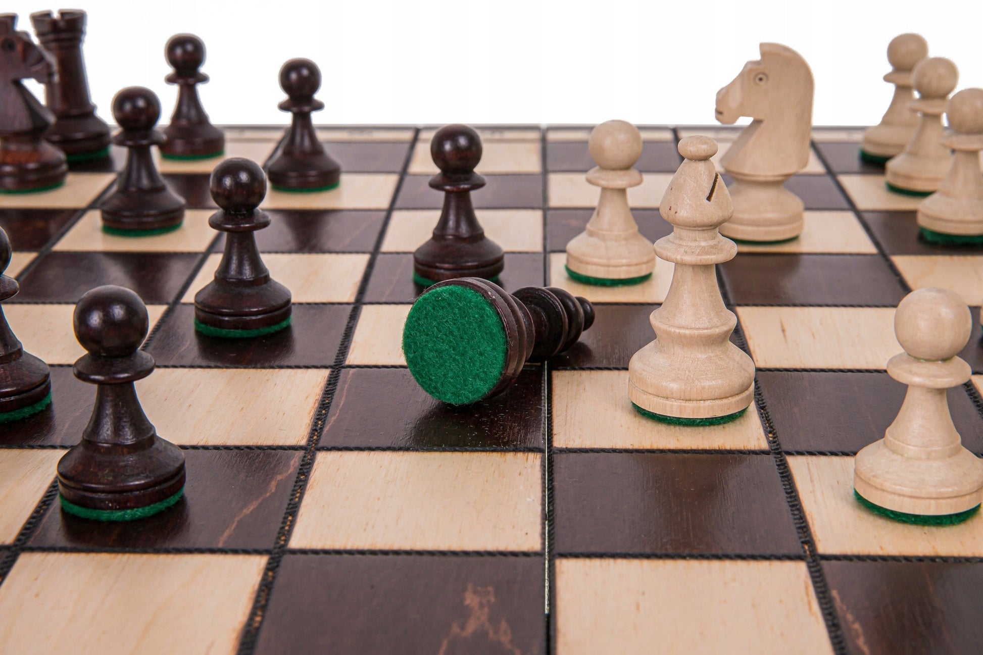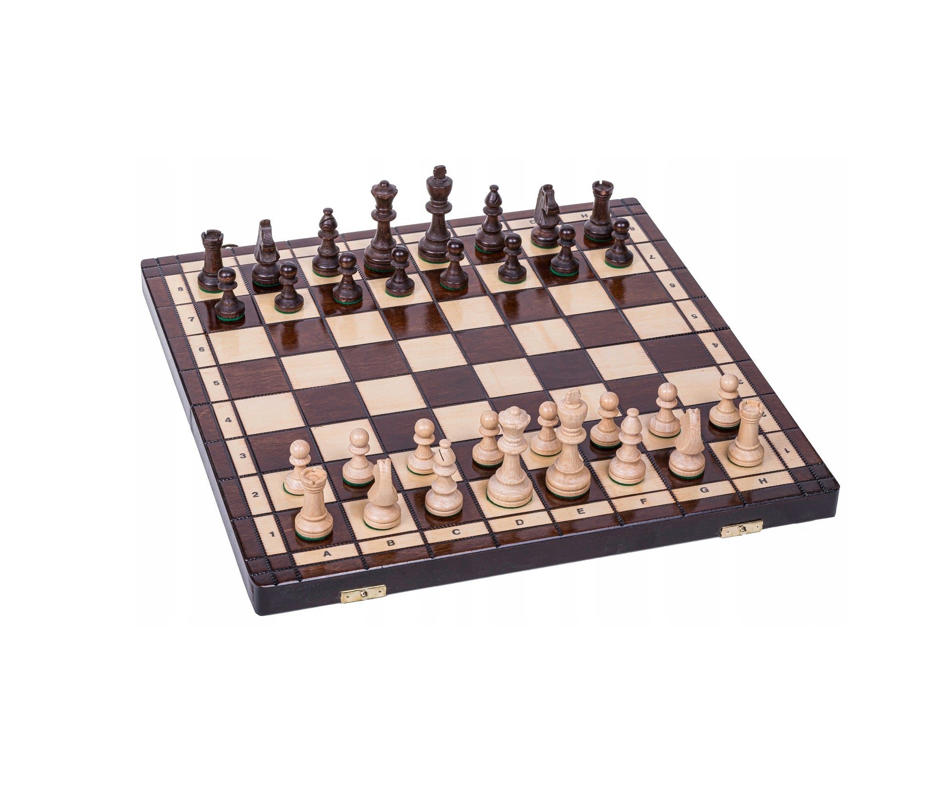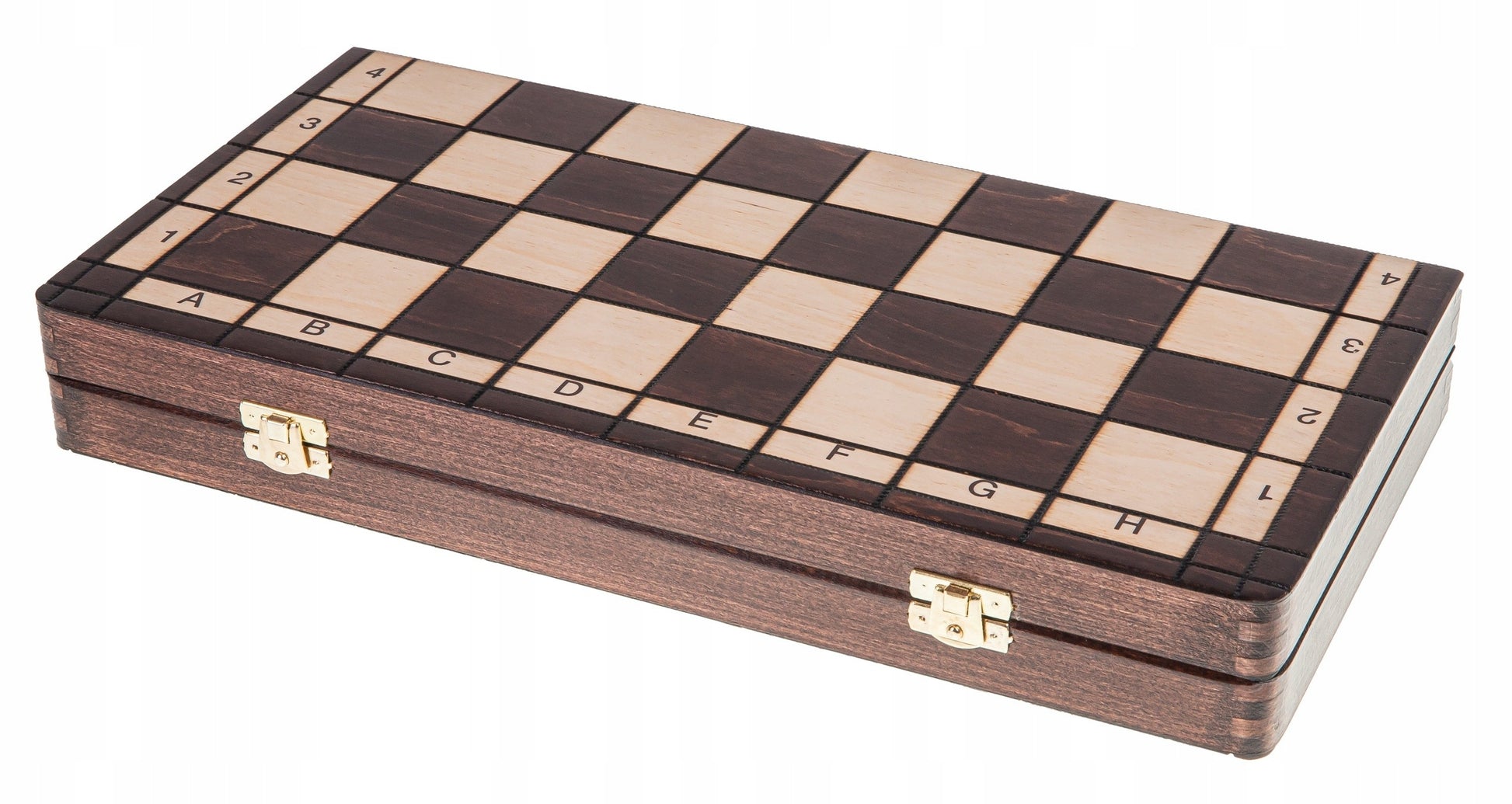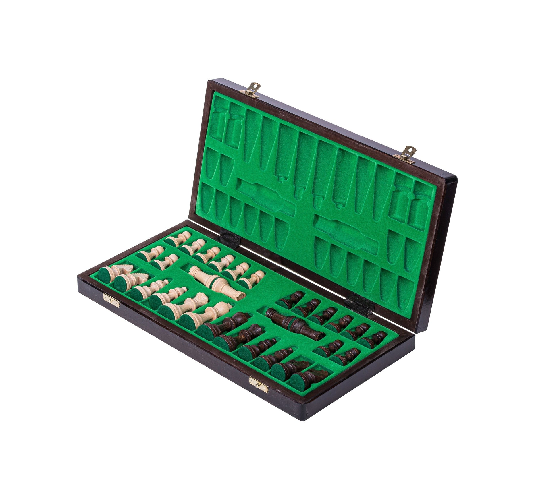 Elegantiška rankų darbo šachmatų lenta, pagaminta iš aukštos kokybės buko ir beržo medienos. Šachmatų figūrėlės – iš uosio medienos, kruopščiai drožtos ir apklijuotos veltiniu, kad žaidimo metu slystų tyliai ir švelniai. Visa šachmatų rinkinys yra padengtas pusiau blizgiu laku, kuris suteikia išskirtinį spindesį ir apsaugą nuo nusidėvėjimo.