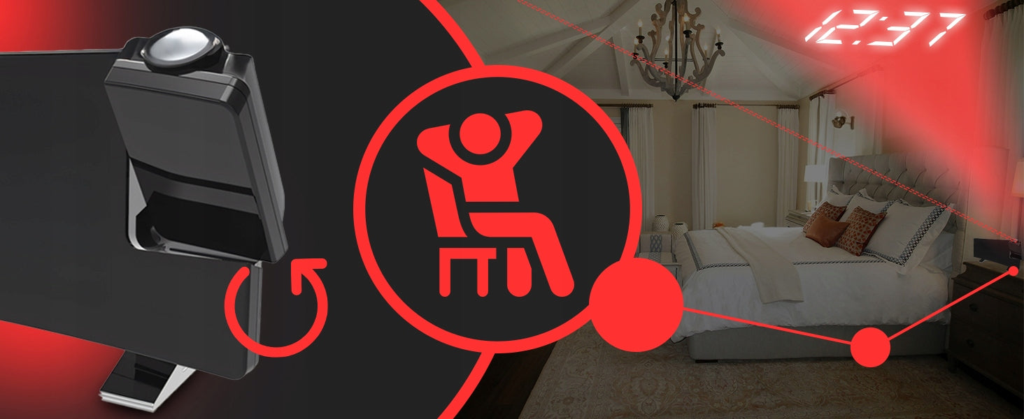 Ar kada nors svajojote matyti laiką tiesiog pažvelgę į lubas? Mūsų žadintuvas su projektoriumi tai padarys realybe. Integruotas projektorius gali rodyti laiką bet kurioje pasirinktoje vietoje, suteikdamas Jūsų aplinkai modernumo ir originalumo. Ši funkcija itin patogi, leidžianti lengvai sužinoti paros metą net vidury nakties, neblaškant partnerio ar neišjungiant pagrindinio apšvietimo. 180° kampu reguliuojamas projekcijos dizainas užtikrina, kad lengvai pritaikysite projekciją prie bet kurio kambario išdėstymo, o jautrus šviesos jutiklis automatiškai reguliuoja ekrano ryškumą pagal aplinkos apšvietimą, taupydamas energiją ir užtikrindamas optimalų matomumą.