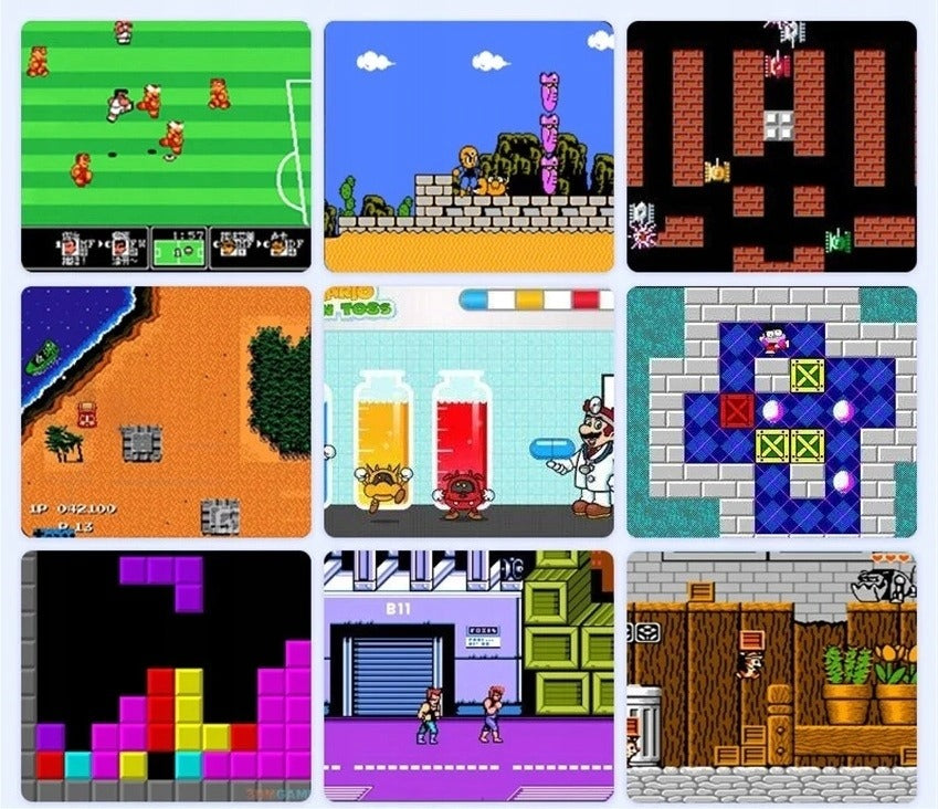 Super Mario Bros, Contra, Chip & Dale, Tetris, Pac-Man, Bomberman, Donkey Kong, Street Fighter, Space Invaders, Tank 1990, Batman, Spider-Man, Angry Birds ir daugelis kitų legendinių pavadinimų.