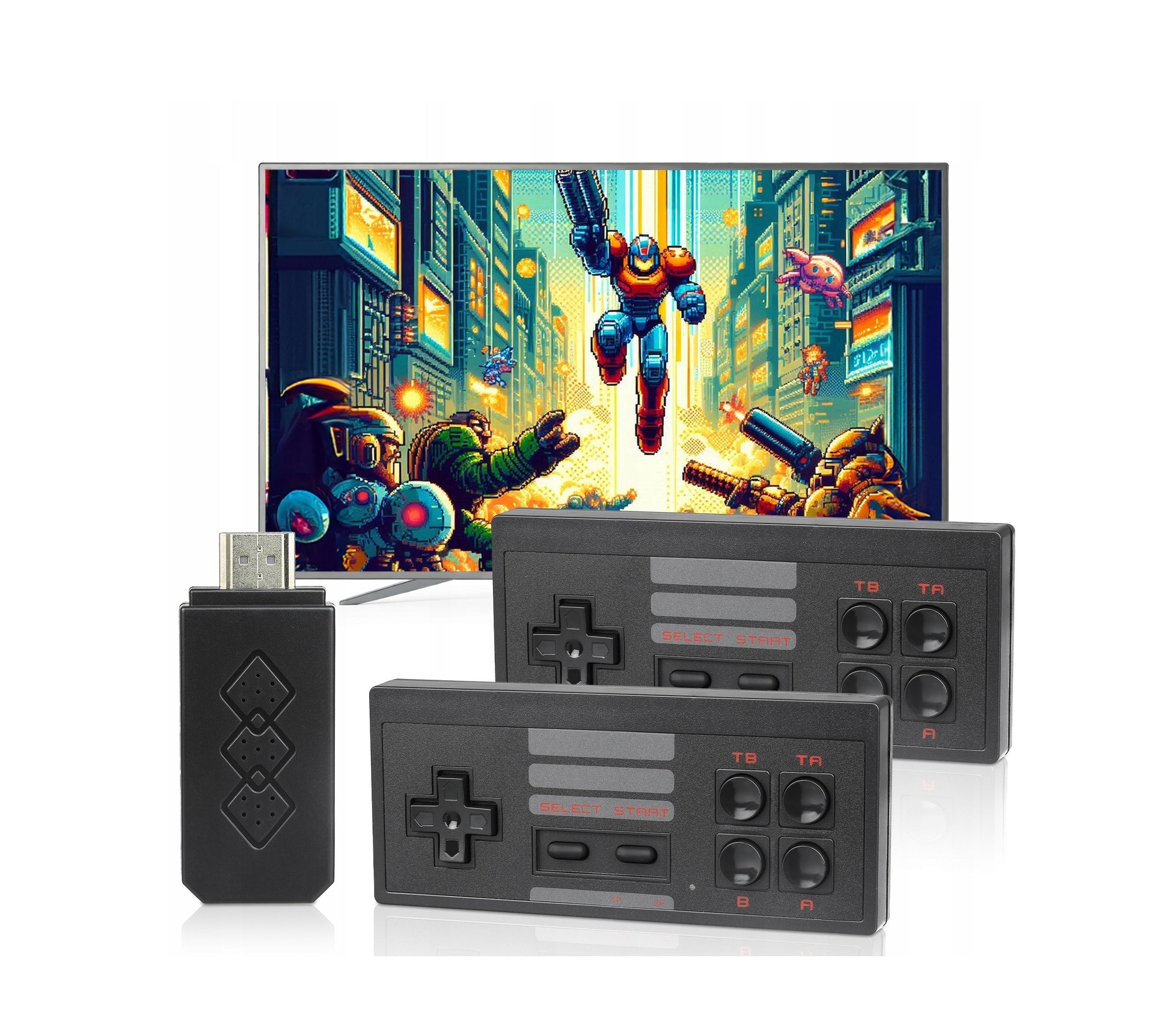 Retro žaidimų konsolė su HDMI išvestimi, FULL HD vaizdu ir 848 įdiegtų 8-bit žaidimų, įskaitant Contra, Pac-Man, Mortal Kombat, Bomber Man, Popeye, Turtles ir daug kitų.