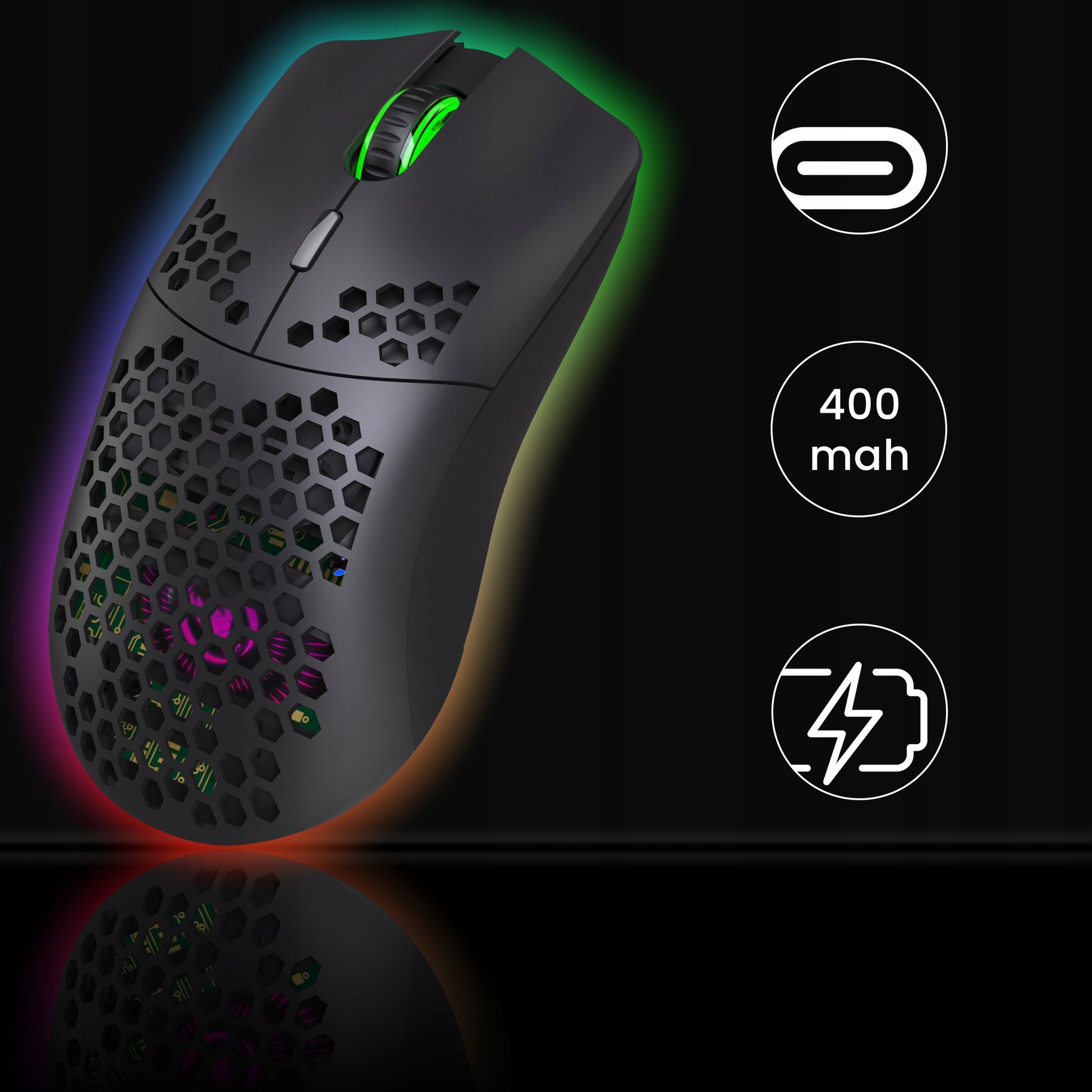 Patirkite žaidimų pasaulį iš naujo su mūsų pažangia belaide žaidimų pele. Sukurta atsižvelgiant į žaidėjų poreikius, ši pelė pasižymi ne tik išskirtine ergonomika, užtikrinančia komfortą net ilgiausių sesijų metu, bet ir aukščiausios klasės funkcijomis. Integruotas 400 mAh akumuliatorius, 2400 DPI optinis jutiklis ir įspūdingas RGB apšvietimas su 11 režimų paverčia ją ne tik patogiu įrankiu, bet ir stilingu jūsų kompiuterio stalo akcentu. Dėl dviejų jungties režimų (Bluetooth ir 2.4 GHz) bei „Plug & Play“ technologijos, prisijungimas yra itin greitas ir paprastas, nereikalaujantis papildomų tvarkyklių diegimo.