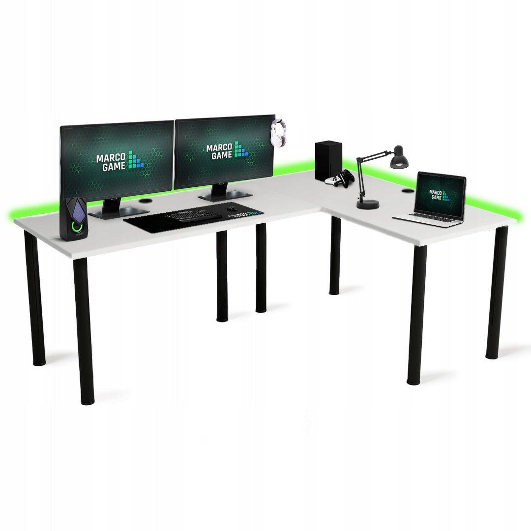 Stalas MARCO GAME CORNER pasižymi apgalvota komplektacija, užtikrinančia pilnavertę patirtį iš karto po surinkimo. Gamykliškai paruošti du atskiri stalviršiai, kurie suformuoja L raidę, aštuonios tvirtos metalinės kojos ir visi reikalingi tvirtinimo elementai yra įtraukti į komplektą. Taip pat rasite LED RGB apšvietimo sistemą su nuotolinio valdymo pulteliu, leidžiančią personalizuoti jūsų aplinką. Ergonomiški laidų pravedimo įvadai užtikrina tvarką.