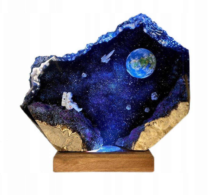 Ši rankų darbo naktinė lempa pagaminta iš natūralaus medžio ir skaidrios epoksidinės dervos, todėl kiekvienas gaminys yra unikalus meno kūrinys. Lempoje atsiveria įspūdinga kosminė scena – raketa, astronautas ir žvaigždėtas dangus, subtiliai apšviečiami švelnia LED šviesa.
