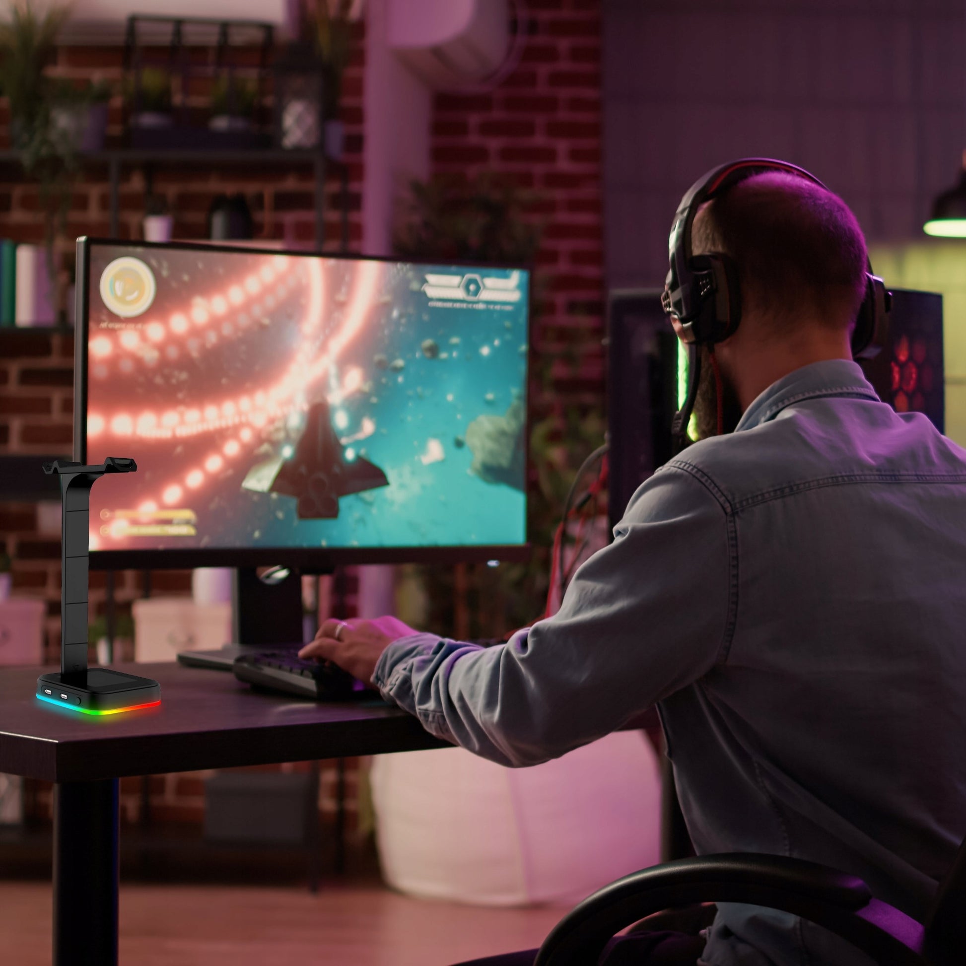 Tobulas Jūsų Žaidimų Kampelio Akcentas: Stovas Ausinėms su RGB Apšvietimu ir USB Hub